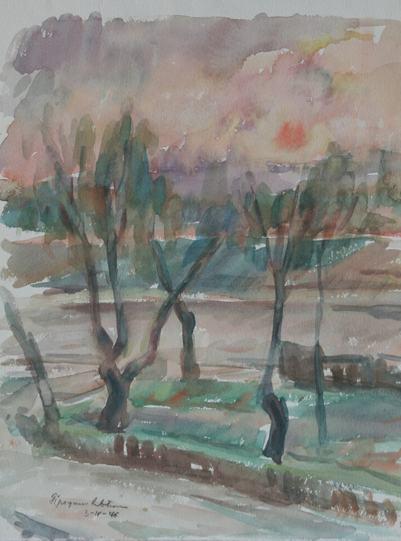 Божидар Продановић, Дрвеће поред реке, 1946, акварел, 30х24 cm